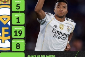 Whoscored评选西甲9月最佳球员:姆巴佩4场5球1助攻成功当选