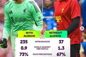 英超官方盘点阿利森缺战时利物浦数据,场均丢球增加0.4球