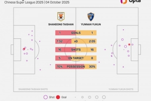 云南玉昆本场有8次射正,追平球队单场中超射正次数的纪录
