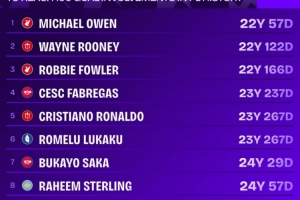 英超参与100球最年轻球员榜:欧文22岁57天居首,C罗第5、萨卡第7