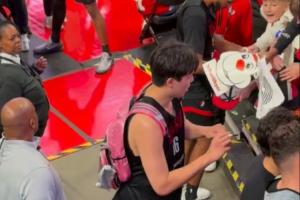 这手速得练练了😂杨瀚森背着尬舞时的粉色包包 给场边球迷签名