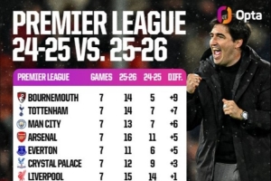 英超较上赛季同期拿分情况:伯恩茅斯+9分最多,热刺+7分曼城+6分