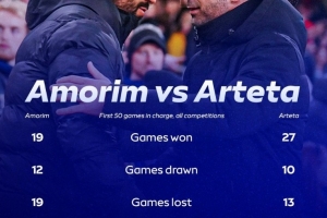 阿莫林执教曼联前50场vs阿尔特塔阿森纳前50场:后者战绩全面占优