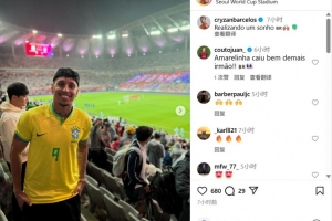 身穿自己名字的巴西9号球衣!克雷桑现场观战巴西vs韩国