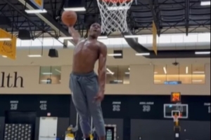 极度舒展!湖人新秀阿杜自抛自扣 垫步起飞单臂轰炸篮筐!
