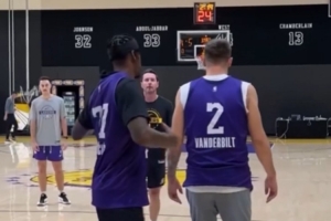 哥俩好!东契奇和范德比尔特队内训练时互换球衣