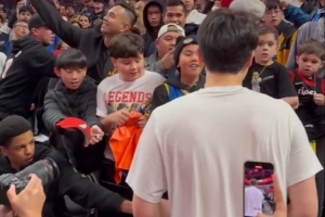 这也太幸福了!场边小孩哥球迷获得杨瀚森球鞋 小杨还顺手签名了