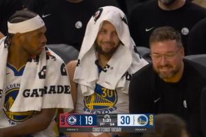 满眼都是羡慕!哈登合球造成霍福德犯规2+1 库里在板凳看着其苦笑