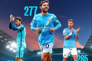 本场比赛也是B席第277次代表曼城在英超出场,升至队史第三位,仅次于席尔瓦的309场以及德布劳内的285场。