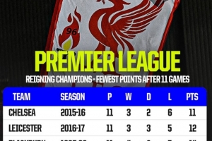 利物浦本赛季前11轮18分,英超历史卫冕冠军同期第四少