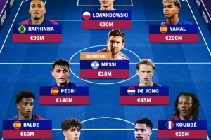 梦幻,德转列若梅西回归巴萨阵容:与亚马尔、莱万、拉菲组攻击线