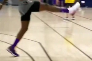老詹在陪练无对抗的情况下脱手,气的直接踢飞篮球