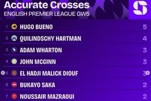 体育资讯9月24日讯英超第5轮战罢,squawkafootball列各项数据排行,狼队后卫乌戈-布埃诺是精准传中次数最多的球员,共5次。英超第5轮精准传中榜:1、乌戈-布埃诺(狼队):5次2、哈特曼(伯
