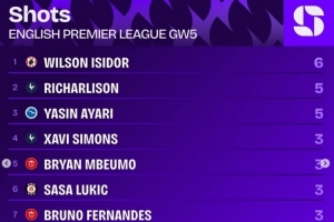 体育资讯9月24日讯英超第5轮战罢,squawkafootball列各项数据排行,桑德兰前锋伊西多是本轮射门次数最多的球员,共6次。英超第5轮射门榜:1、伊西多(桑德兰):6次2、理查利森(热刺):5次