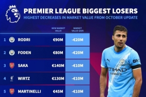 体育资讯10月17日讯德转统计了最新的英超球员身价跌幅榜单,曼城中场罗德里和福登身价均下降2000万欧元,分列前二,阿森纳四人上榜。英超身价跌幅榜:1.罗德里(曼城):最新身价9000万欧元,身价跌幅2